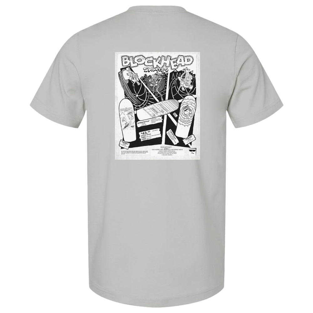 This is the 2nd Blockhead ad ever dropped from the May 1985 Thrasher magazine, and it was what really got Blockhead noticed. Featuring the first 3 models, just kind of a raw, skater-owned, DIY style that really said we’re here and we’re ready to get rad and have some fun! The image on the T’s will be of the original Xerox/X-acto knife/glue stick cut-and-paste layout of the ad!