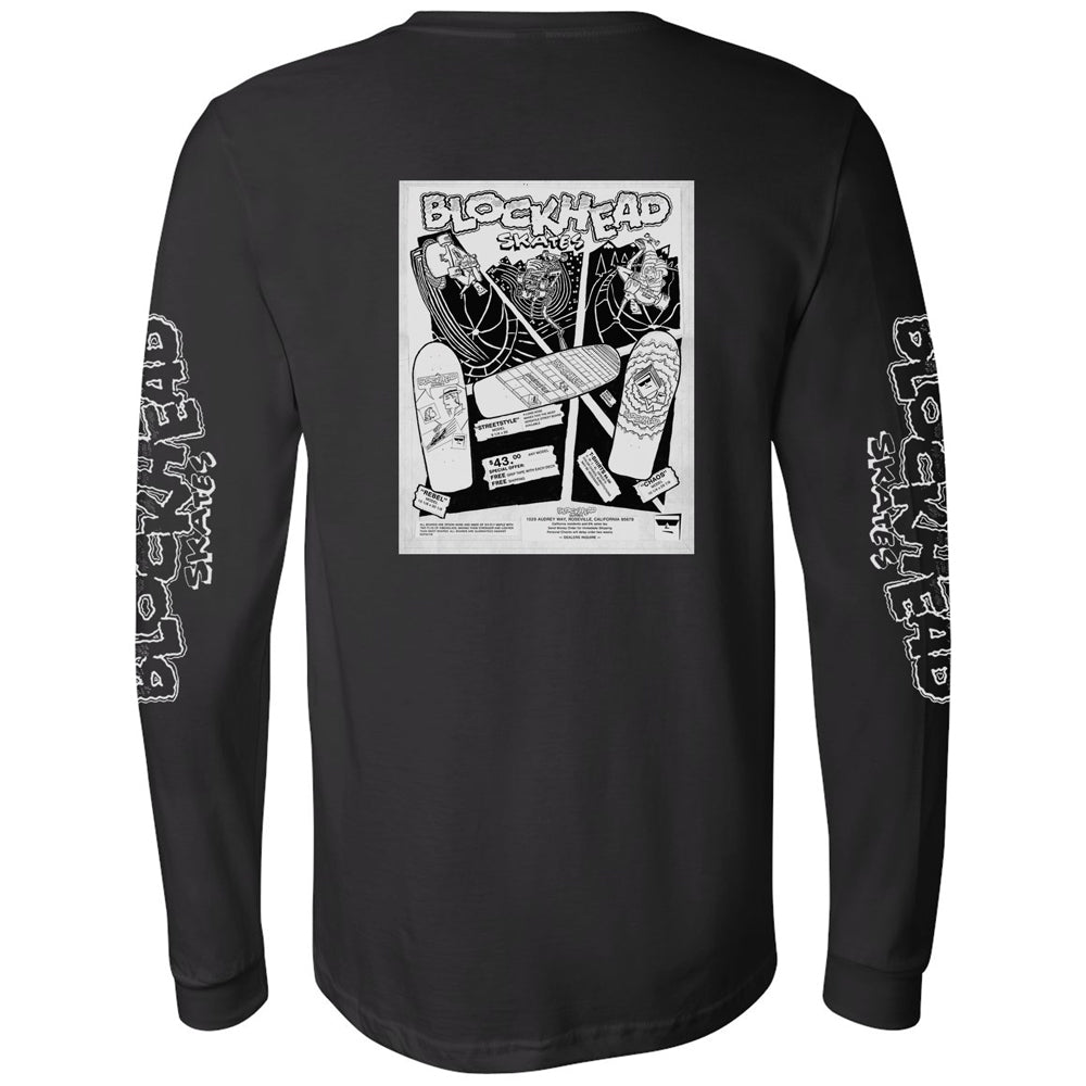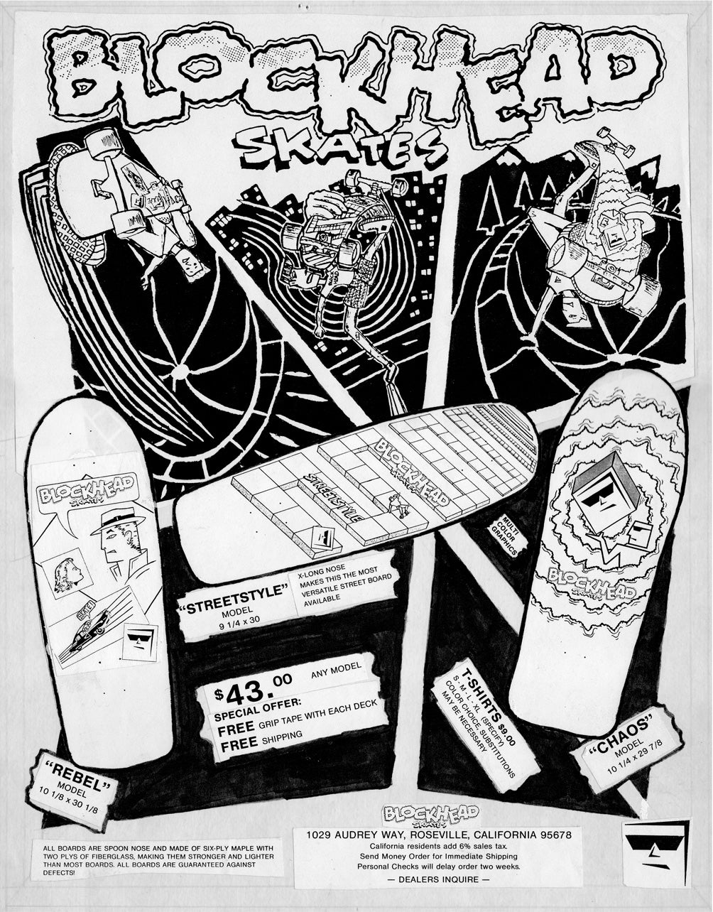 This is the 2nd Blockhead ad ever dropped from the May 1985 Thrasher magazine, and it was what really got Blockhead noticed. Featuring the first 3 models, just kind of a raw, skater-owned, DIY style that really said we’re here and we’re ready to get rad and have some fun! The image on the T’s will be of the original Xerox/X-acto knife/glue stick cut-and-paste layout of the ad!